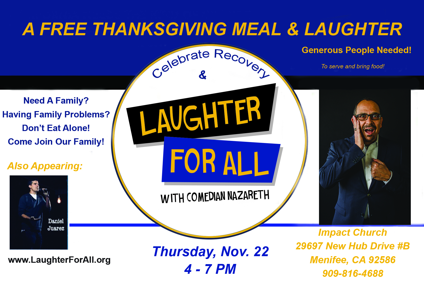 Celebrate Recovery and Laughter For All join forces to bless people with a Thanksgiving meal and Laughter.