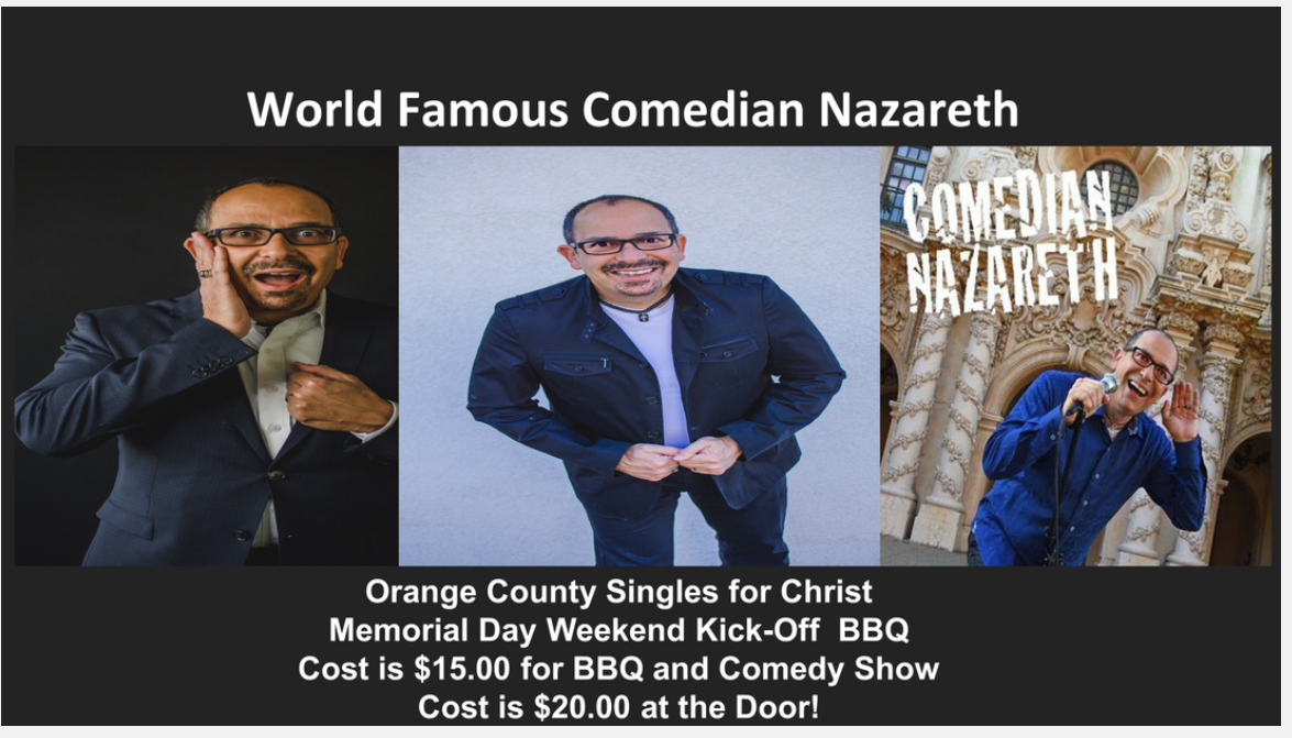 Come on out and join us for our 2024 Annual Memorial Day Weekend KickoffBBQ! We are expecting 150 Single Adults and Couplesfor a Really Fun Night! We look forward to a Fun-Filled Evening of Food,Fellowship, Exceptional Worship by the Jesica Specht Worship Band, a stirring message by our Guest Speaker, and Fantastic Comedy Show featuring World Famous Comedian Nazareth! All thebelow is offered for an AMAZING PRICE of JUST $15.00!!